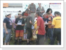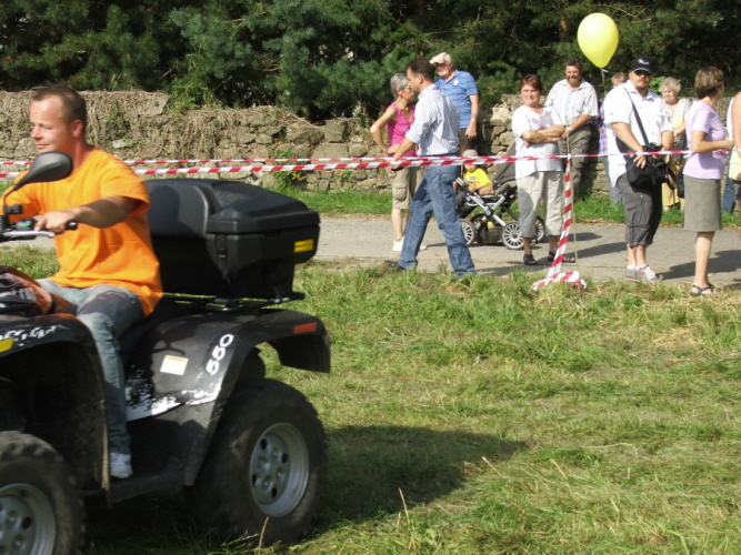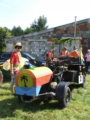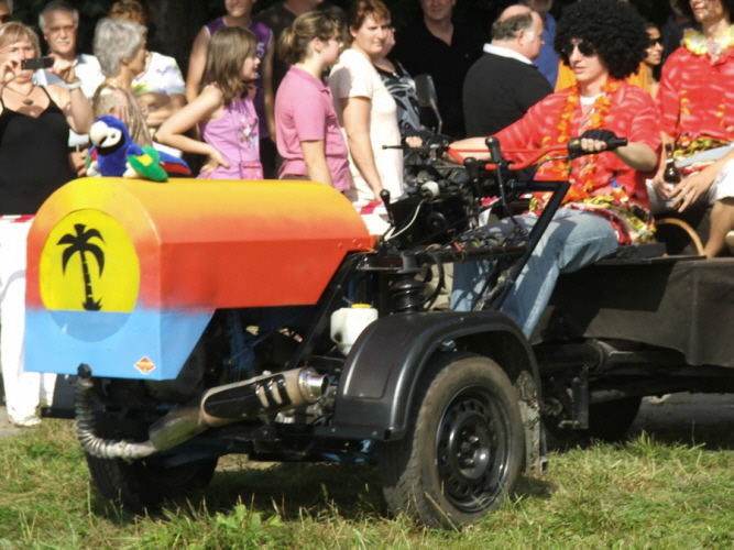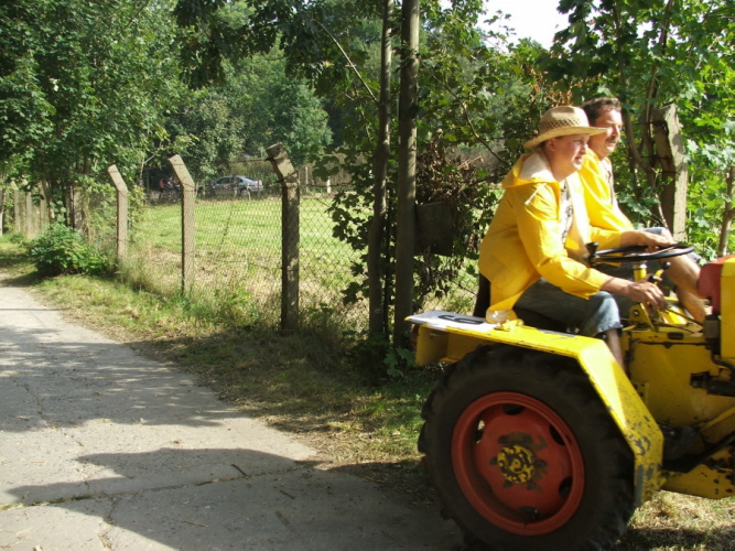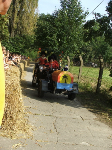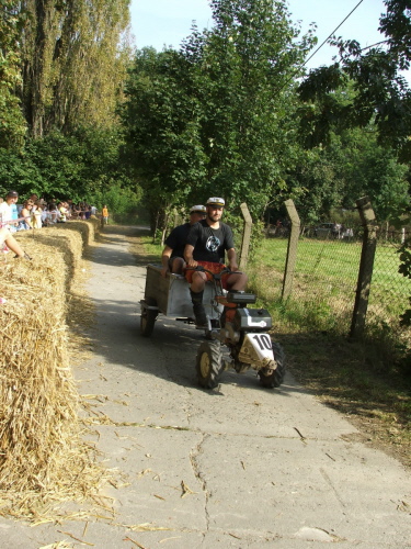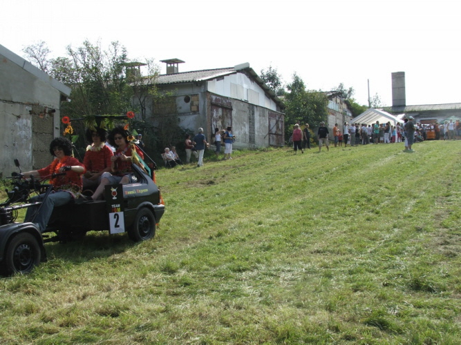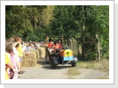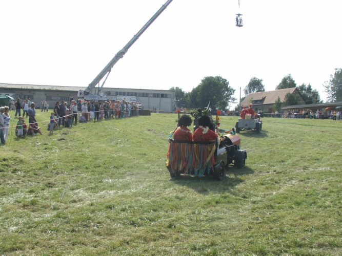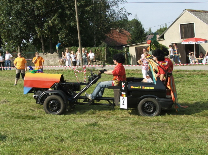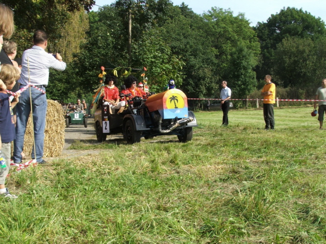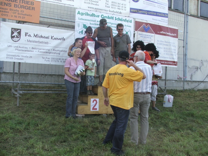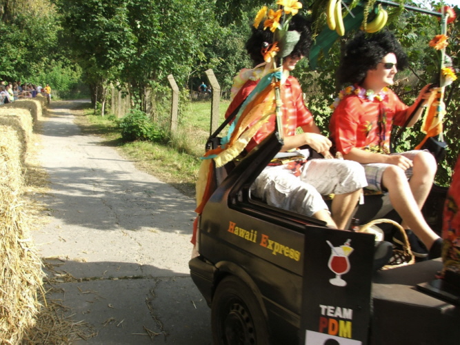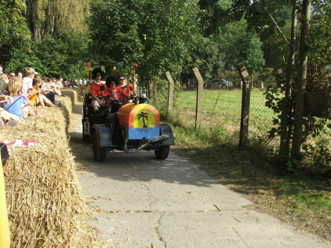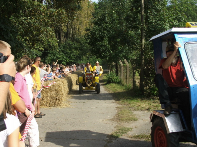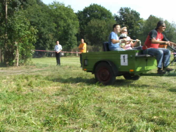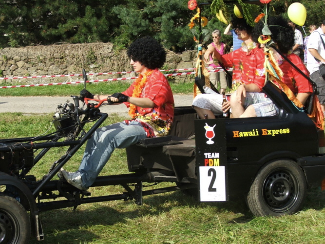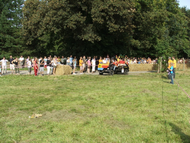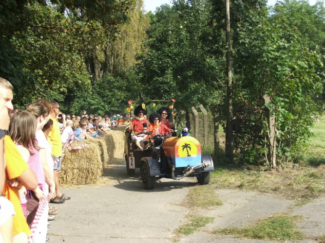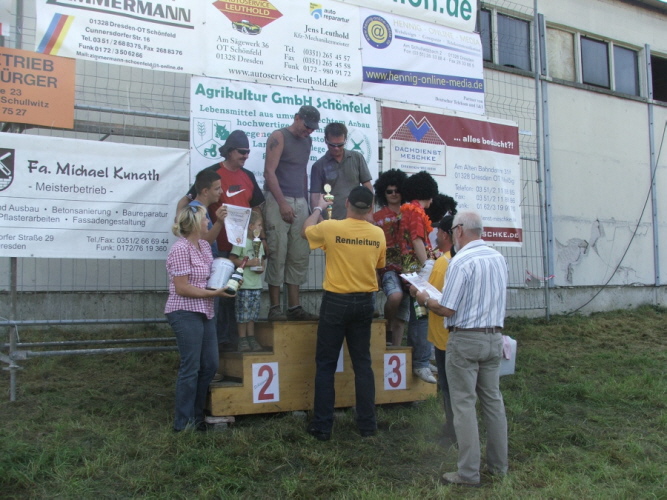 Besonders sportlich zeigte sich Bernd Träger, der seinem „Taxi“ alle Ehre machte und dem schon vor dem Start ausgeschiedenen Gunter Merten als Beifahrer die Teilnahme am Rennen ermöglichte. Unsere prominenten Rennteilnehmer „Hannah Montana“ mit Tilo und Melanie Nacke erreichten das Ziel ebenfalls wegen Motorschadens nicht und mussten mit Hilfe des „Safety-Cars“ von Lars Großmann zurück ins Fahrerlager geschleppt werden. Gewohnt gemächlich und mit viel Freude legte Jens Bürger die Strecke mit seinem knallorangen Fahrzeug zurück und hielt so, wo nicht überholt werden konnte, das Fahrerfeld zusammen.