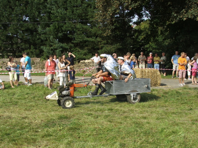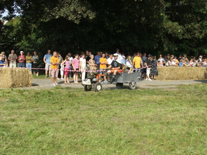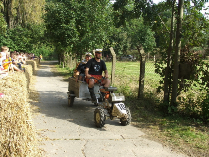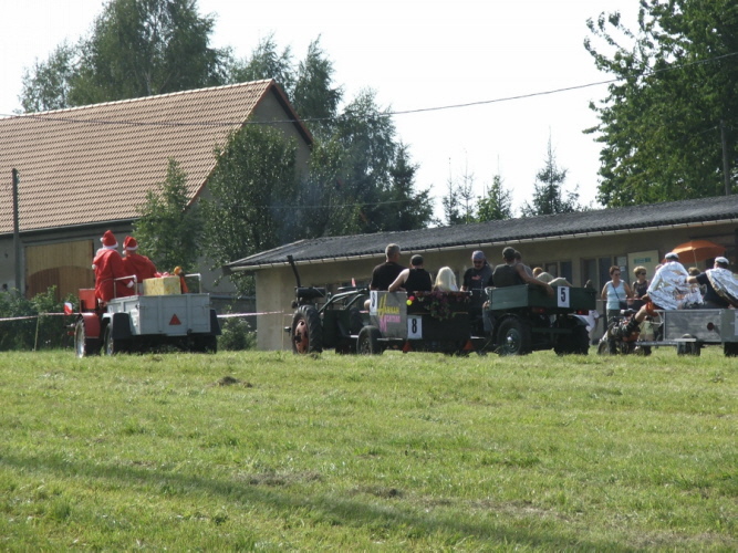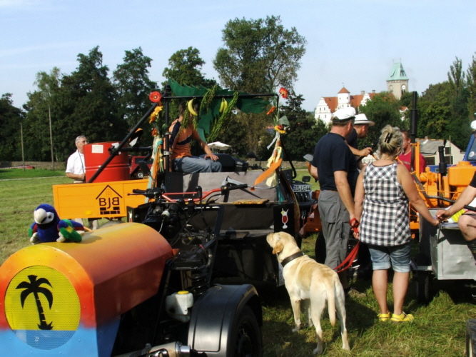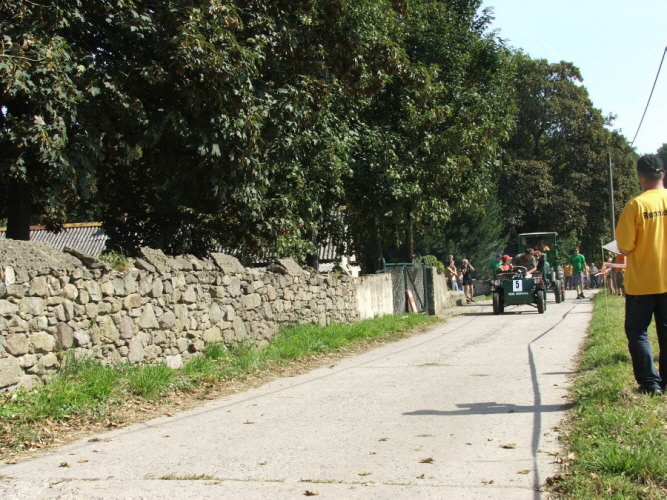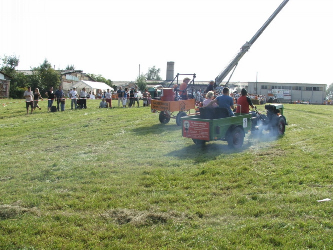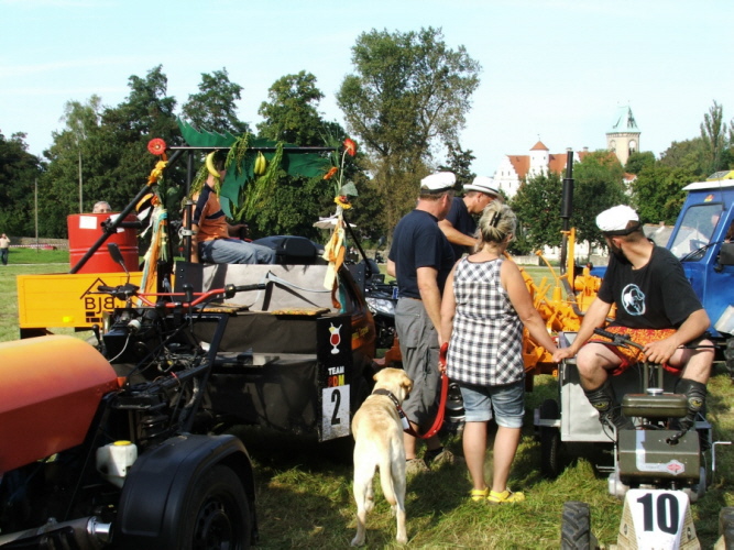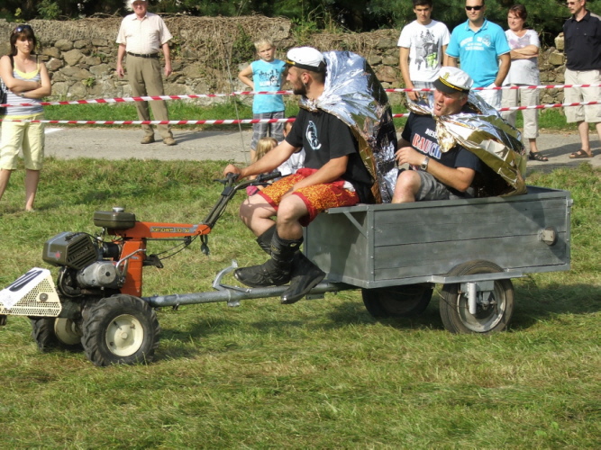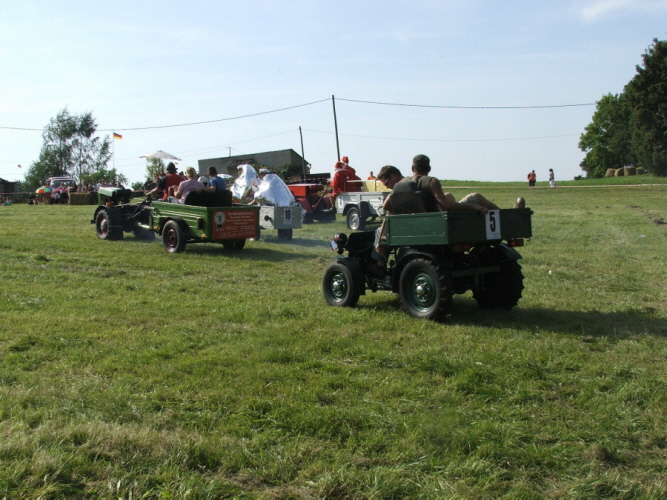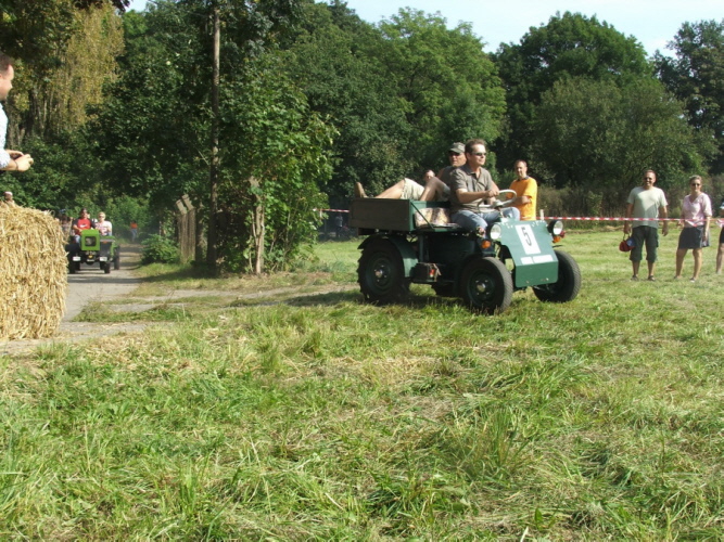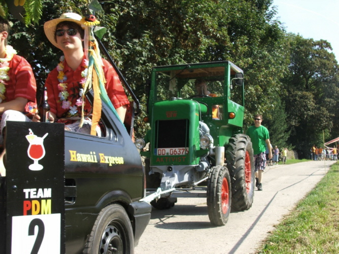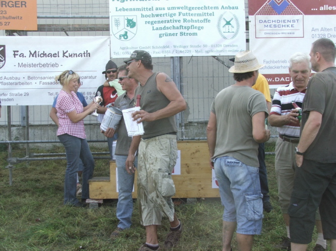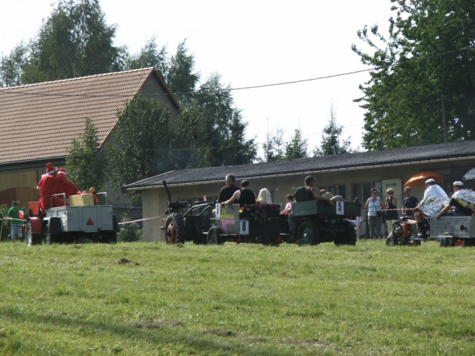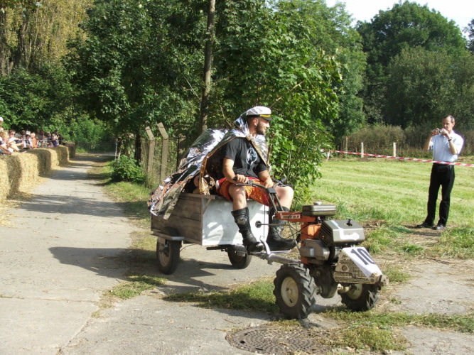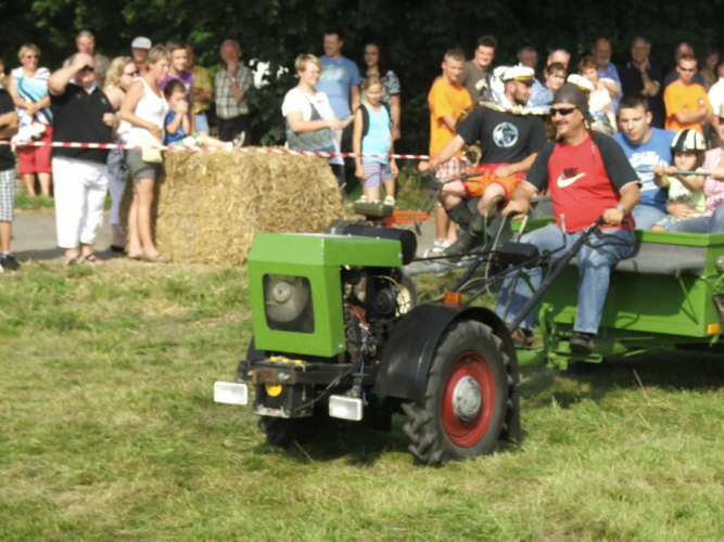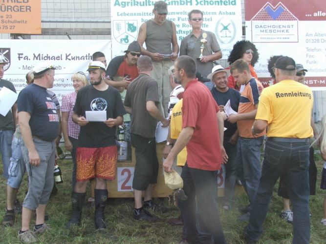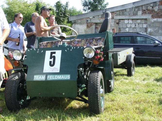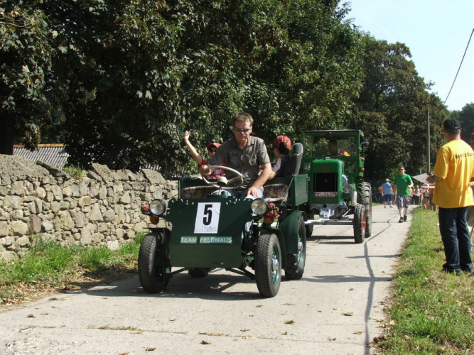 Nach einer verdienten Pause, in der die Fahrzeuge nochmals auf ihre Funktion gecheckt wurden und Hunger und Durst beim Schönfelder Jugendclub gestillt werden konnten, wurde um 14.45 Uhr das Rennen gestartet. Es nahmen nun neun Fahrzeuge am Start Aufstellung. Das Team „Mertens Elche“ aus Dresden konnte dabei schon nicht mehr antreten, da das um 1945 erbaute Gerät einem Motorschaden erlegen war.