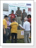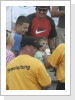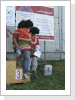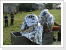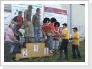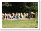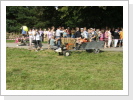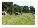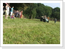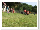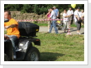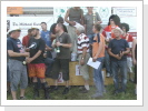 Nacheinander wurden die Fahrzeuge heraus gewunken, um sich zu einem Büchsenwerfen einzufinden. Aus den Dosen, welche nicht getroffen wurden und der Platzierung nach dem Schleppen, errechnete sich nun die Strafzeit, die in der „Boxengasse“ abgewartet werden musste. Mit nur 10 Sekunden Strafzeit aus der ersten Disziplin kamen dabei die „Gelben Engel“ am besten davon, die mit einem einzigen von drei möglichen Würfen alle zehn Büchsen umwarfen. Die längste Zeit hatten die „Kapitäne“ aus Eschdorf mit Georg Friebel abzuwarten, weil sie mit ihrem kleinen Gefährt schon eine erhebliche Strafzeit aus dem Schleppen mitgenommen hatten und leider auch keine Büchse trafen. Das nahmen sie aber mit viel Humor und zumindest auf das Durchhaltevermögen ihres Fahrzeuges konnten sie sich verlassen, mit dem sie unbeschadet ins Ziel kamen, denn auch die „Weihnachtsmänner“ schieden leider während des Rennens mit Motorschaden aus.