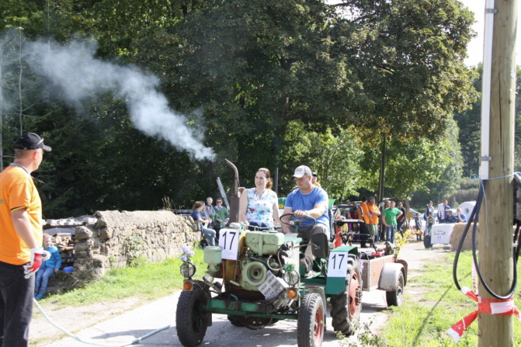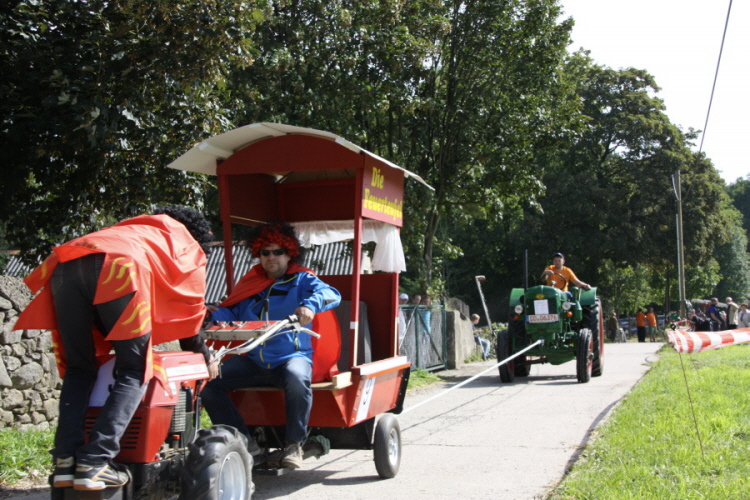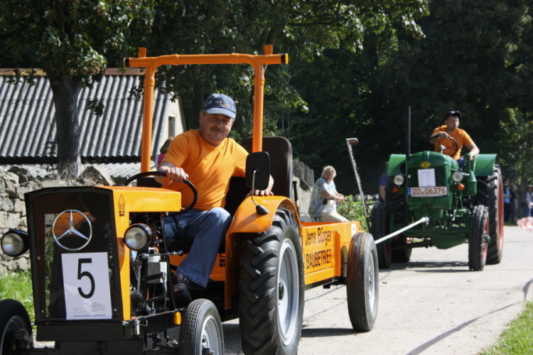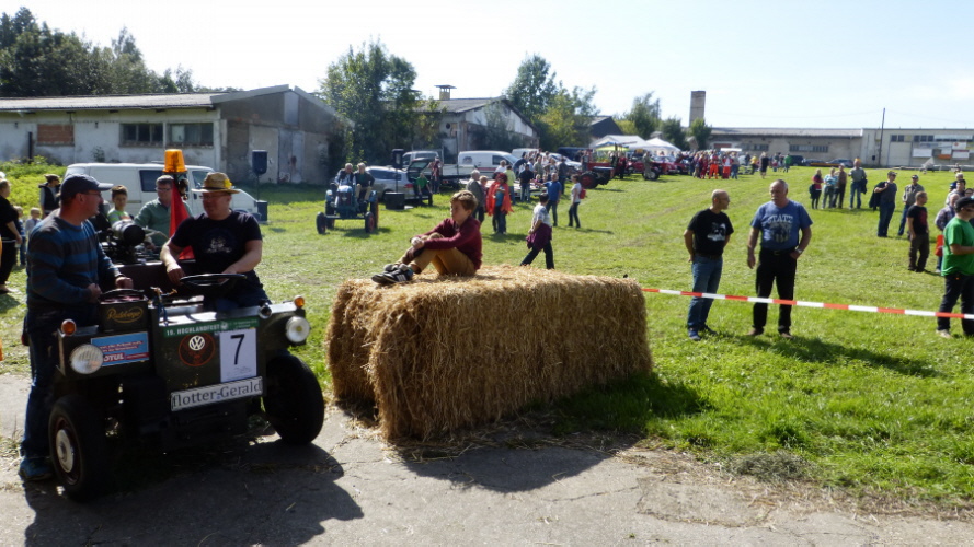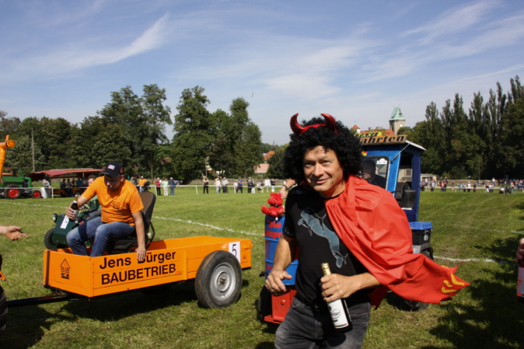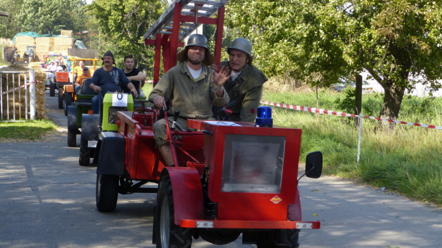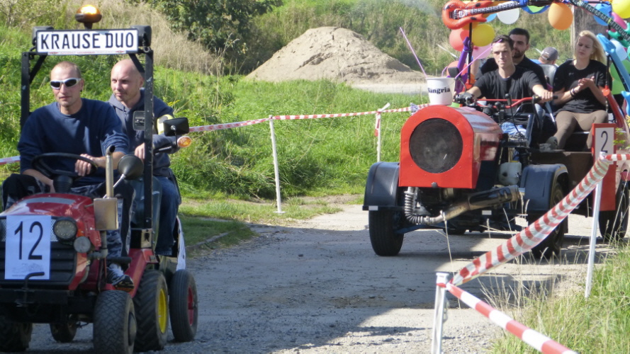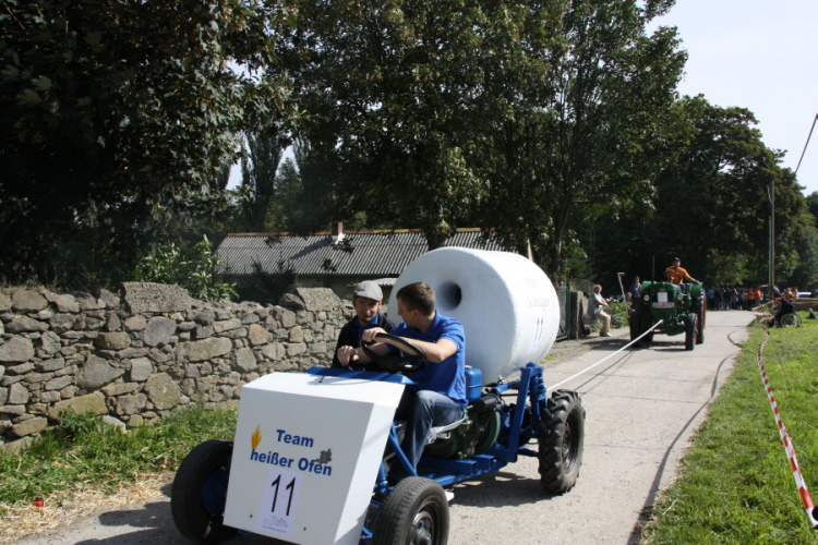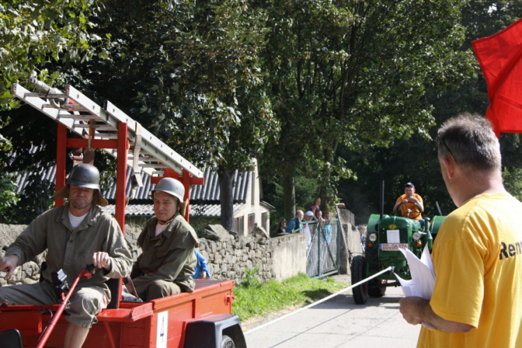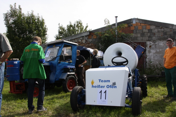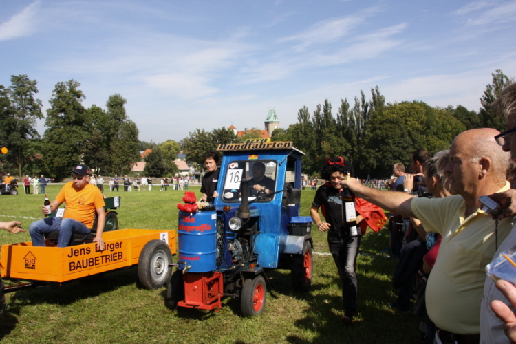 Mit wahrhaftem Feuereifer kämpften nun alle Teilnehmer um die Platzierungen. In manchen Gesichtern waren Konzentration und Ehrgeiz zu erkennen, in anderen stand Enttäuschung geschrieben, weil die Maschine ihren Dienst versagte und viele strahlten einfach nur, weil sie eine Menge Spaß hatten und vom Publikum kräftig angefeuert wurden. Die Fans vom „Team Feldmaus“ taten das sogar mit eigenen Schildern. Der legendäre „Schlusslicht-Schlepper“ von Jens Bürger bekam dieses Mal tatsächlich noch langsamere Konkurrenz und auch die Fahrt von Gunter Merten stand in diesem Jahr unter keinem guten Stern, denn sein Gefährt blieb wieder mit einem Schaden auf der Strecke. Die „Feuerwehr“ aus Rockau spritzte sich hingegen einfach den Weg frei.