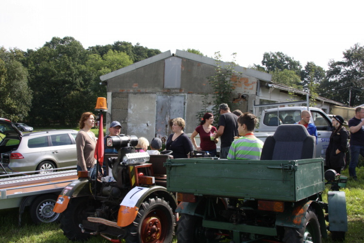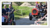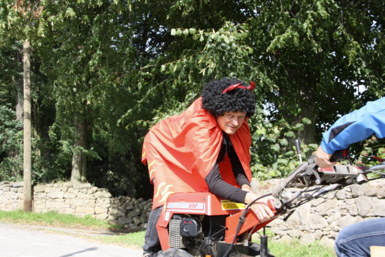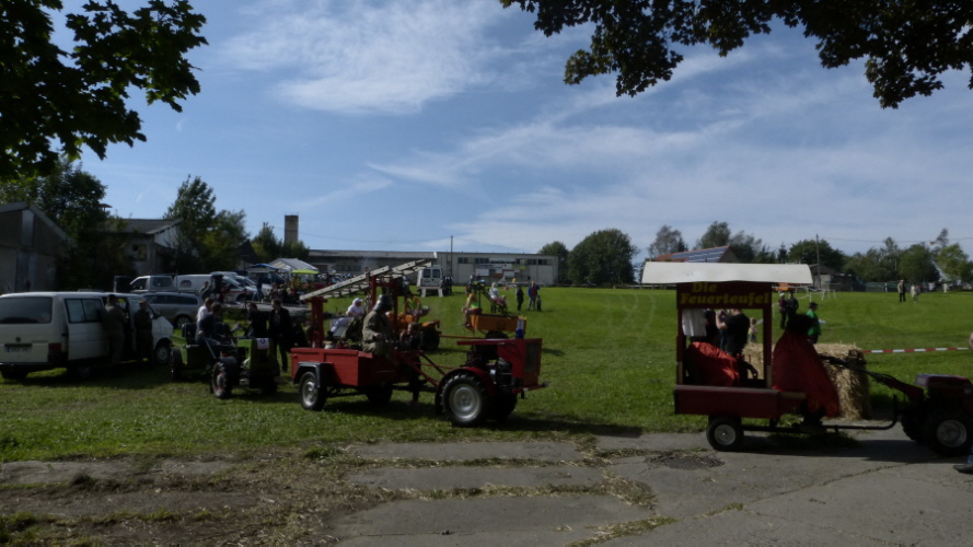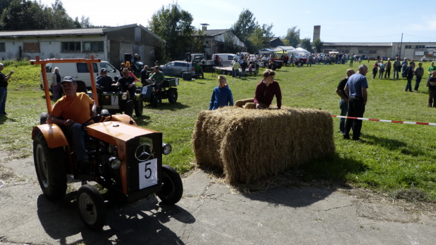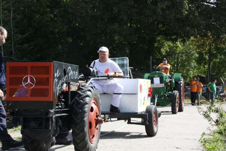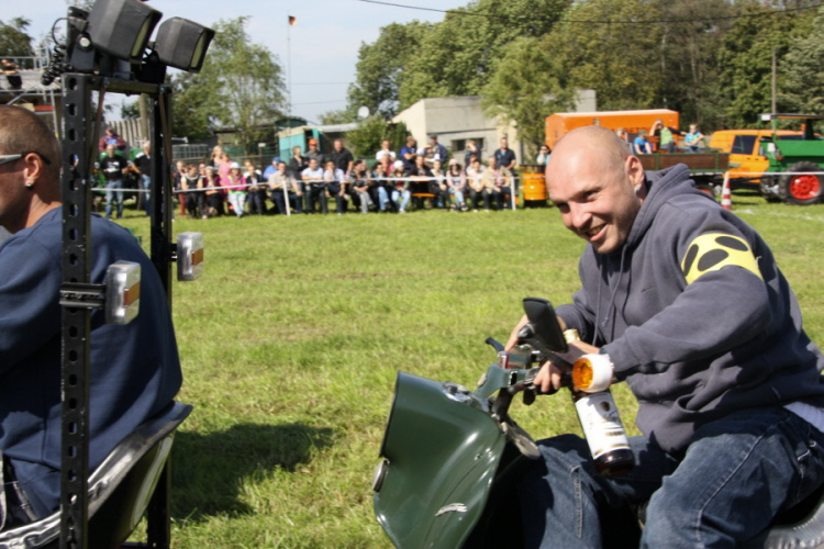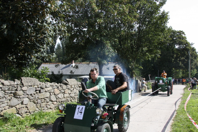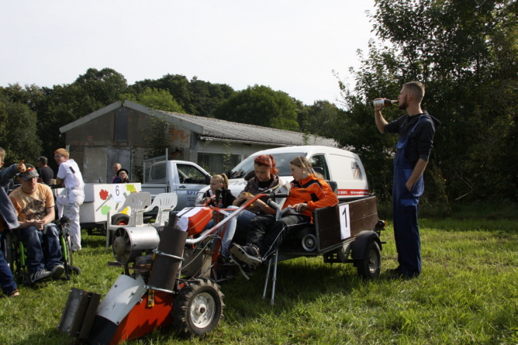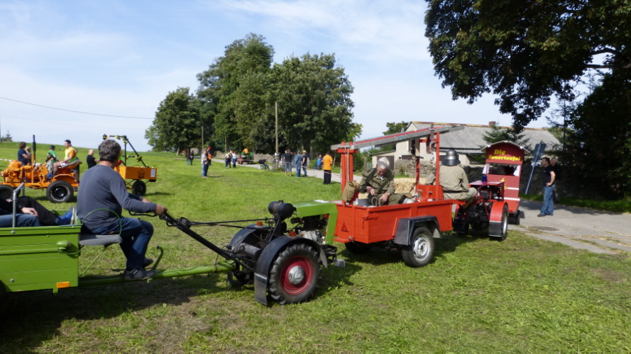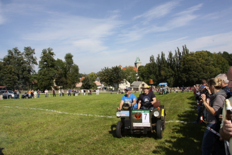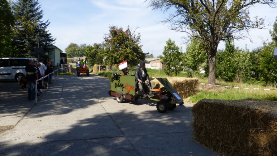Mit wahrhaftem Feuereifer kämpften nun alle Teilnehmer um die Platzierungen. In manchen Gesichtern waren Konzentration und Ehrgeiz zu erkennen, in anderen stand Enttäuschung geschrieben, weil die Maschine ihren Dienst versagte und viele strahlten einfach nur, weil sie eine Menge Spaß hatten und vom Publikum kräftig angefeuert wurden. Die Fans vom „Team Feldmaus“ taten das sogar mit eigenen Schildern. Der legendäre „Schlusslicht-Schlepper“ von Jens Bürger bekam dieses Mal tatsächlich noch langsamere Konkurrenz und auch die Fahrt von Gunter Merten stand in diesem Jahr unter keinem guten Stern, denn sein Gefährt blieb wieder mit einem Schaden auf der Strecke. Die „Feuerwehr“ aus Rockau spritzte sich hingegen einfach den Weg frei.